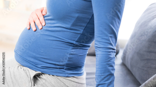 Pregnant tired exhausted woman with stomach issues and back pain at home on a couch, being sick.