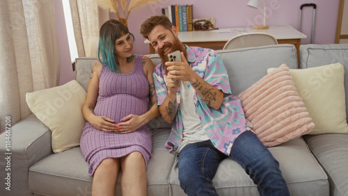 Pregnant woman and man sitting on sofa together in colorful living room, looking at a phone and smiling, with pastel decor and natural light filling the cozy home interior.
