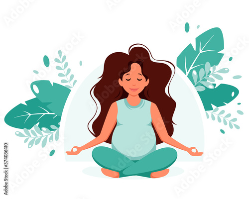 Pregnant woman doing yoga on nature background. Pregnancy health, meditation concept. Vector illustration in flat style.