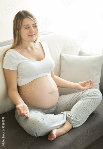pregnant woman practicing yoga on sofa at living room