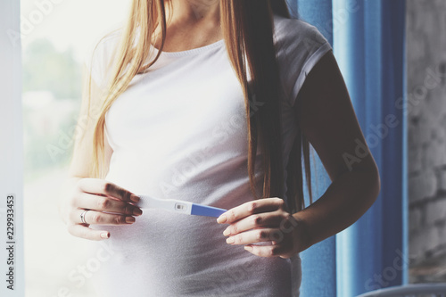 Pregnant woman with a test. Pregnancy. Close up portrait of pregnant woman. Pregnant belly,maternity, motherhood, pregnancy, happiness concept.