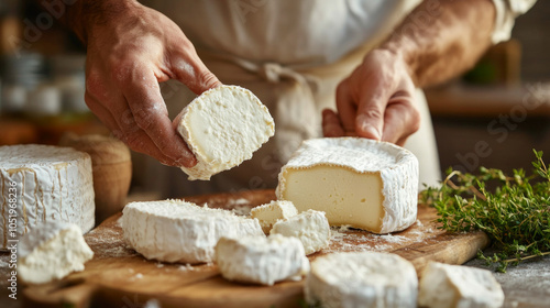 Preparing artisan goat cheese from fresh milk in a rustic kitchen with natural ingredients at midday