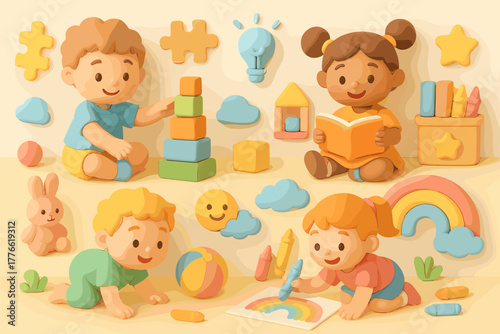 Preschool Kids Playing and Learning – Cute 3D Illustration of Early Childhood Education