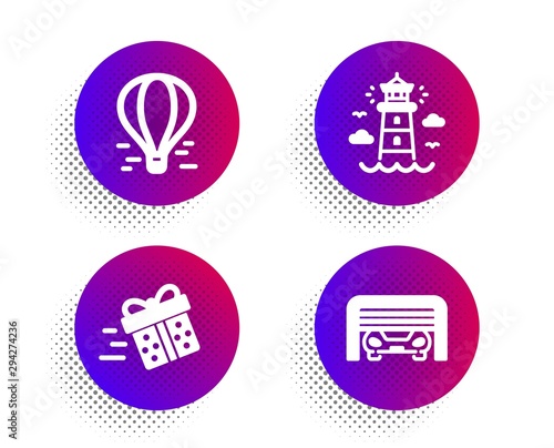 Present delivery, Air balloon and Lighthouse icons simple set. Halftone dots button. Parking garage sign. Shopping service, Flight travel, Beacon tower. Automatic door. Transportation set. Vector
