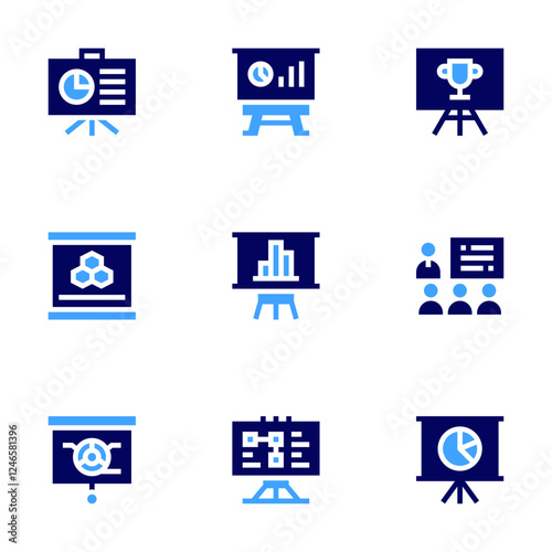 Presentation icon set. Bold style. Duotone colors. slideshow, presentation, winning, whiteboard, classroom, analytics, piechart, dna, statistics