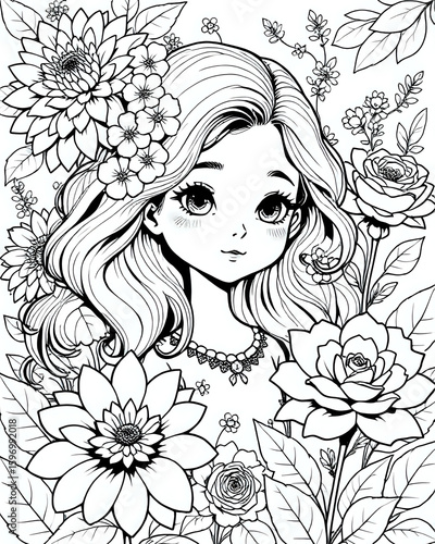 Pretty girl with various flowers surrounding her - beautiful garden - coloring page for kids and adults - black and white coloring book - no shading - for women and female - floral designs - theme