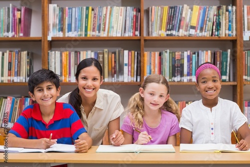 Pretty teacher helping pupils in library