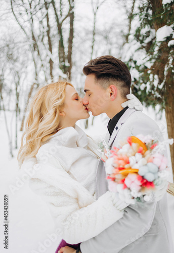 Pretty young bride kissing her handsome groom, a winter fairy tale.