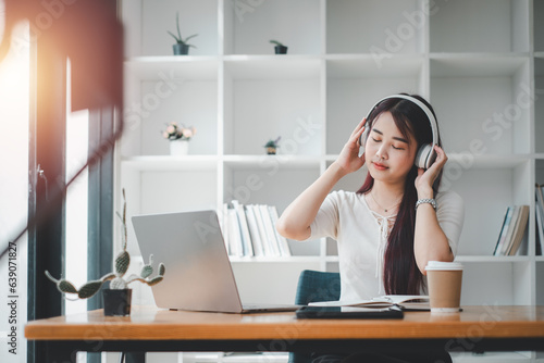 Pretty young woman listening to music with laptop computer and relaxing while sitting on chair at home.