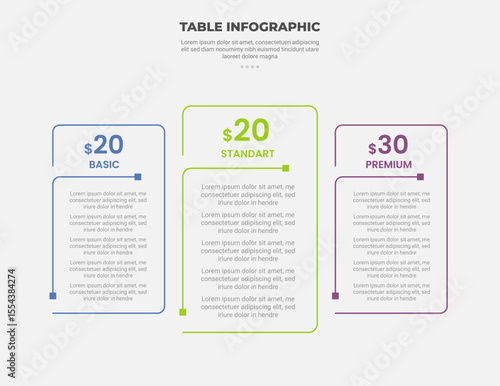 pricing table box infographic outline style with 3 point template with minimal line structure slice for slide presentation