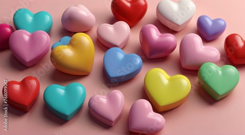 Produce a collection of 3D cartoon-style colorful heart-shaped toys, each uniquely designed and vibrant in hue. Ensure they're isolated on a light pink background, creating a visually appealing contra