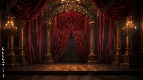 Produce a digital photorealistic image of a luxurious velvet theater curtain drawn back to reveal a grand stage, bathed in golden light Use rich, deep red tones and intricate detailing to capture the