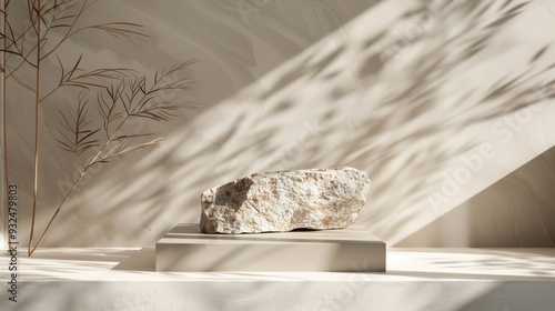 Product display featuring a stone, minimalist approach, and natural leaf shadows