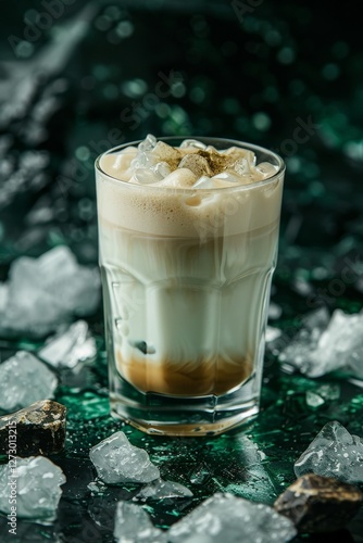 Product photo of Matcha Latte Macchiato, brewed coffee, on slate surface, isolated on white background. studio lighting.