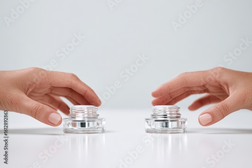 Product selection stress concepts. Two hands reaching for jars on a minimalist surface, symbolizing skincare or beauty products.
