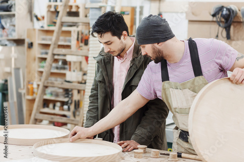profession, carpentry, woodwork and people concept - Two busy successful carpenters discuss the current furniture project in a large industry shop