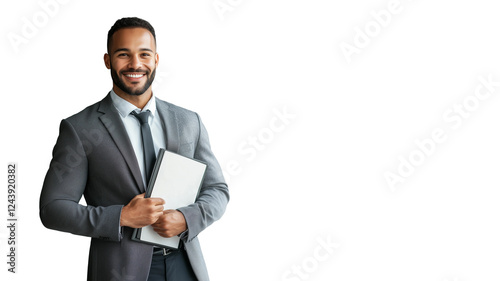 Professional business man,smiling and holding documents on white background,copy space,web banner.