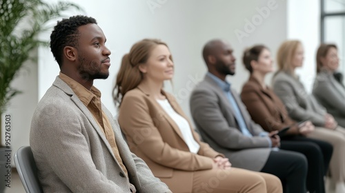 Professional Candidates Sitting in Modern Office Lobby Diverse Group Happy Expressions Business Casual