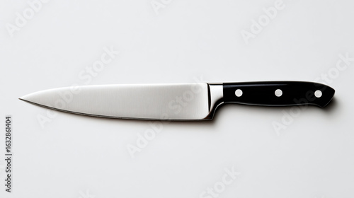 Professional chef's knife with polished stainless steel blade and glossy black ergonomic handle on clean white background