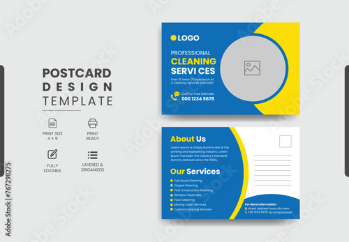 Professional cleaning services postcard template design, creative modern cleaning services agency postcard.