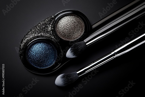 Professional dark themed makeup arrangement with metallic eyeshadows and brushes emphasizing a sleek and luxurious aesthetic perfect for editorial and fashion forward beauty looks