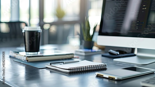 Professional desk setup with a computer, phone, notebook, and pen, ready for efficient work tasks