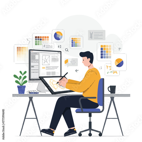 Professional graphic illustrator working comfortably at a modern desk, drawing on a large digital tablet screen with a stylus, rendered as a simple 2D flat vector illustration on a white background.