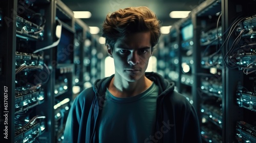 Professional it specialist repair computer network in control data room.