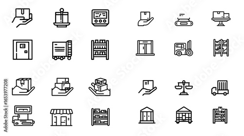 Professional line icon set of logistics and warehouse management. Includes delivery, storage, inventory, supply chain, and packaging symbols for business, factory, and industry design.