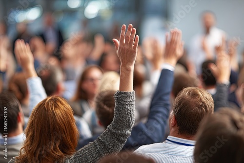 Professional Meeting with Engaged Audience Raising Hands for Questions in Modern Conference Space