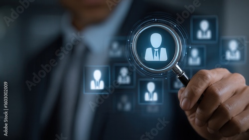 Professional searching through candidate profiles, examining resumes magnifying representing glass, with recruitment and human resources strategy