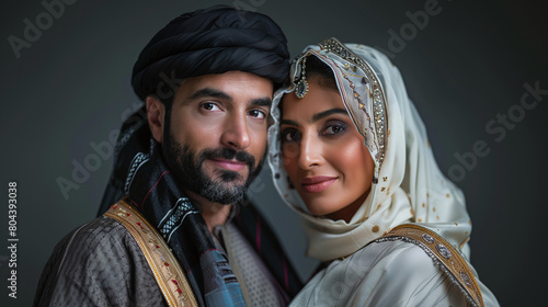 professional studio photography of Middle eastern couple portrait, traditional kandura or hijab clothing