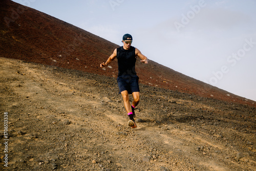 Professional trail runner descending steeply down a rocky slope