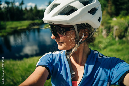 profile of a face in a bicycle helmet. The beautiful cyclist takes a selfie