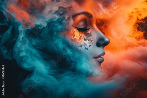 Profile of a female face dissolving into vibrant swirling colors and puzzle pieces symbolizing emotional release thought expansion and mental creativity in a surreal artistic setting