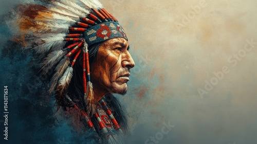 Profile portrait of a Native American man in traditional headdress. Rich, earthy tones and a contemplative mood.
