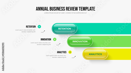 Project Performance Three Option Diagram Presentation Layout. Creative Development 3 Element Infographic Slide Template. Advertising Insight Slideshow Design Vector Illustration.