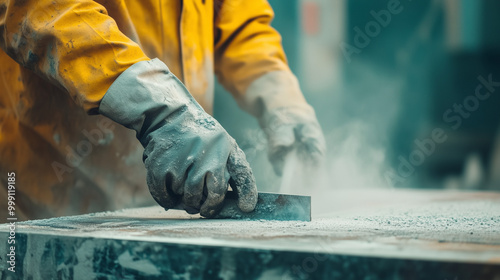 Przemysłowy robotnik bez odpowiedniego sprzętu ochronnego, zajmujący się azbestem, co symbolizuje niebezpieczeństwa związane z pracą w przemyśle.