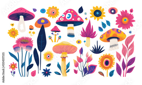 Psych grainy flat vector set, mushroom, leaves and flower colorful elements flat style, summer, spring party, eyes, eye, surreal liquid stile, festival cartoon