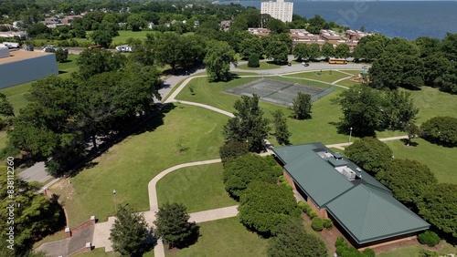 Public park outdoor space beside Hampton Roads Harbor in Newport News, Virginia in summer with sunshine and blue sky perfect day for outside activity