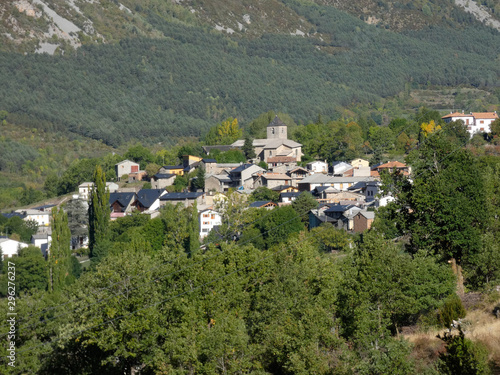 Pueblo de chía en medio del pirineo de Huesca, Aragón, España, en medio de altas montañas del Pirineo muy cerca con la frontera francesa.
