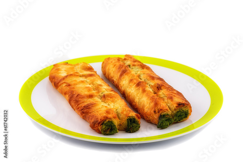 Puff pastry bun isolated on white dish. Healthy patty with spina