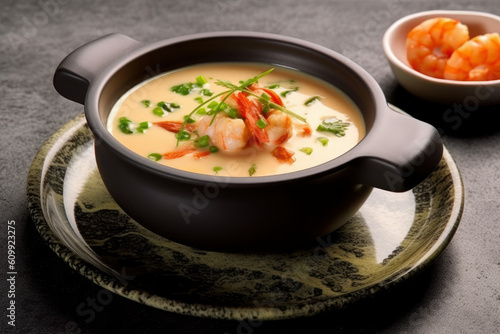 Pumpkin cream soup with shrimp and spicy herbs, AI Generated