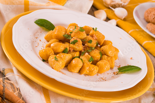 Pumpkin gnocchi with grated amaretti cookies.