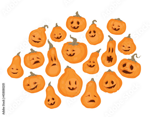 Pumpkin, Jack the lantern set. Autumn decorative design, Halloween. Isolated vector colorful element on a white background.