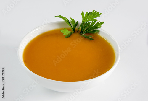 Pumpkin soup served in a bowl on white background