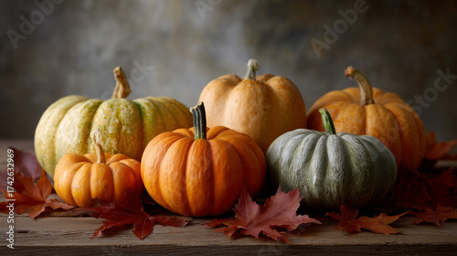 Pumpkins And Leaves On Wooden Table Creating Fall Mood