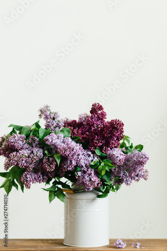 Purple bouquet of lilac flowers in a stylish vase on wooden table