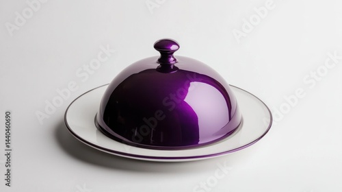 Purple metallic serving cloche above an empty white plate on white background.