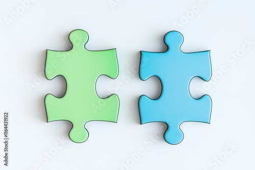 Puzzle components in bold blue and green tones interlocking seamlessly on a flat 2D design